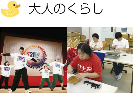 大人になると、くらしの中心は、学校から職場や通所施設などに移ります。最近は、地域の中で自立した生活を送るための小規模なグループホームが少しずつ整備されつつあり、若いうちから親元を離れて暮らす人が増えています。高校卒業後は、一般企業、一般就労を目指す人たちのための支援施設、福祉事業所などで働く人や、障がいのある人の学びの場であるカレッジなどに進学する人もいます。